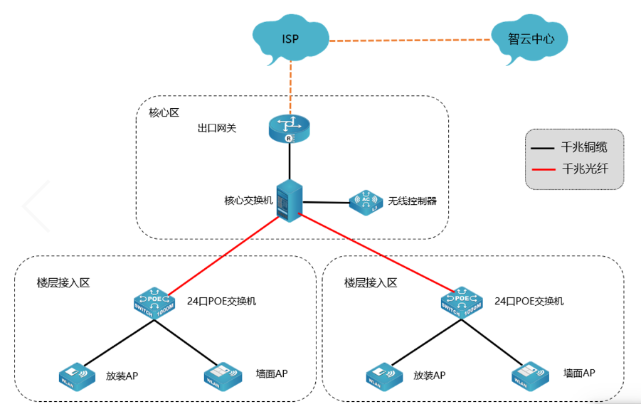 出口网关采用wl瓦力游戏app下载专业的DCME网关设备,综合出口路由器、网监设备和无线控制器三台设备的功能,采用网关设备与智云平台联动的上网方式。